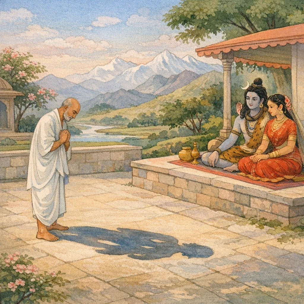 Having again beheld Her in the sky, in a radiant white form, he—becoming single-pointed in contemplation—perceives Śiva, the Supreme Cause of all.