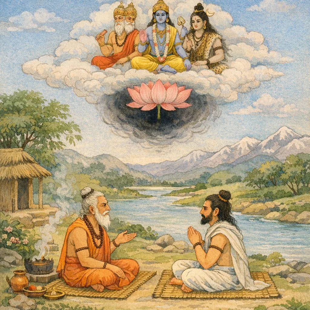 Adhyāya 29 follows the classical Purāṇic question–answer form. After hearing the earlier “great narrative” (the Sanatkumāra–Kāleyasaṃvāda), Śaunaka asks Sūta for a precise account of how Brahmā’s creation (sarga) arises, as transmitted through Vyāsa. Sūta frames the teaching as divya-kathā—divine, purifying, and multi-layered—whose repeated hearing or recitation grants religious merit and sustains one’s lineage (svavaṃśadhāraṇa). The cosmogonic teaching then presents pradhāna and puruṣa as the enduring sat/asat matrix from which the world-fashioner proceeds. Brahmā is described as creator of beings and as Nārāyaṇa-parāyaṇa, and the Trimūrti’s functions are stated succinctly: Brahmā creates, Hari preserves, and Maheśvara dissolves, with no other agency in these recurring cosmic phases. The concrete creation sequence begins when the self-born Brahmā first produces the waters (āpas) and places seed/energy (vīrya) within them, preparing for further emanations.
