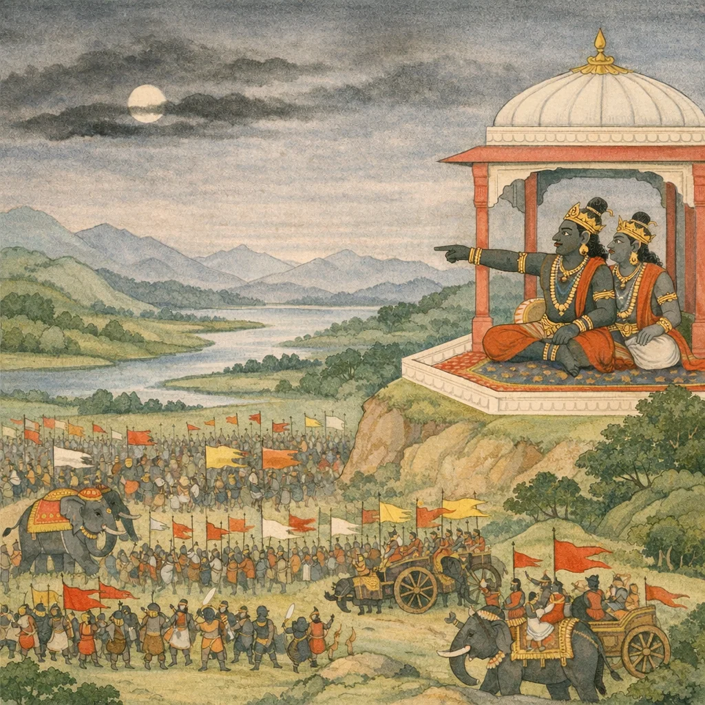 The war-instruments and the spreading darkness function as symbolic diagnostics: adharma, when threatened, amplifies noise, speed, and scale, attempting to eclipse the ‘sun’ of clarity (viveka). The obscured solar chariot signifies a temporary dominance of tamas and confusion before divine reassertion of order.