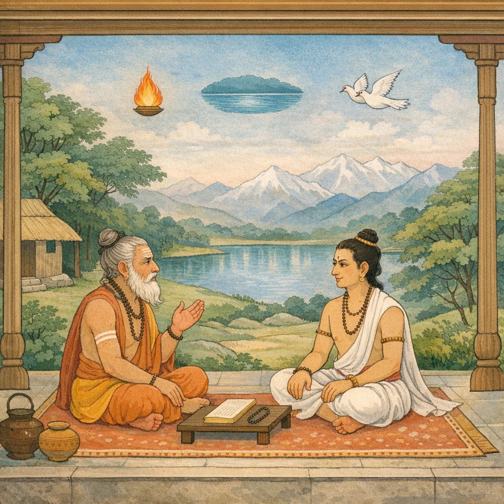 Adhyāya 51 begins with the sages asking Sūta, the foremost Purāṇic narrator, to reveal a further īśa-centered teaching—namely the unsurpassed kriyāyoga of Jagadambā Umā, earlier taught by Sanatkumāra to Vyāsa. Sūta calls it a “supremely guarded secret” and turns to an instructive dialogue: Vyāsa asks Sanatkumāra for the definition (lakṣaṇa), method, and fruit (phala) of Umā’s kriyāyoga, and what is especially dear (priya) to the Supreme Mother. Sanatkumāra then systematizes three paths (mārga): jñānayoga, kriyāyoga, and bhaktiyoga, each granting mokṣa when rightly understood. Jñānayoga is defined as the inward joining of mind with ātman; kriyāyoga as the mind’s joining with external supports (bahyārtha) through disciplined action and ritual; and bhakti as cultivating a sense of unity (aikya-bhāvanā) between the devotee’s self and the Goddess. The chapter establishes a spiritual sequence: karma gives rise to bhakti, bhakti to jñāna, and jñāna to mukti, presenting kriyā as the practical ground that ripens into liberating knowledge.