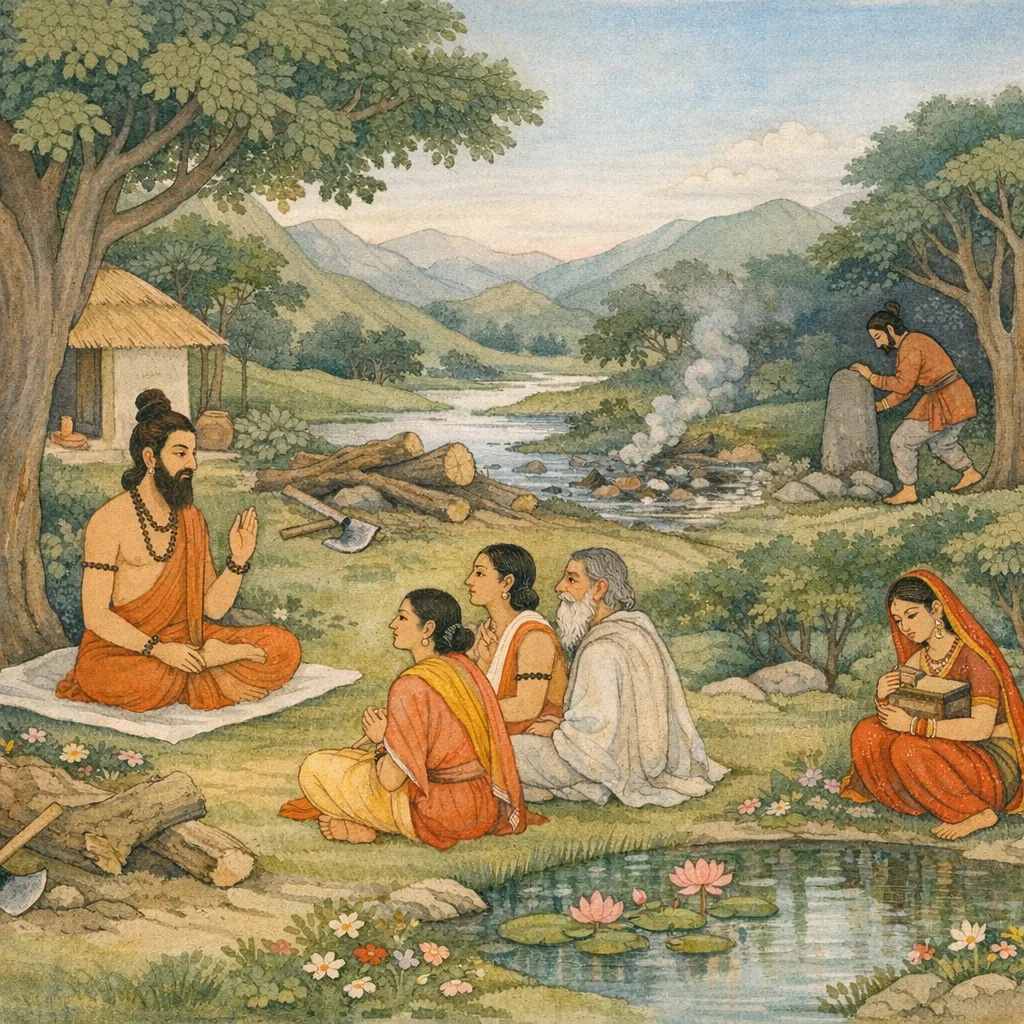 Grass, wood, leaves, flowers, and healing herbs—together with food gained by one’s own simple means; sandals, an umbrella, a cart, a seat, and the kamaṇḍalu (water-pot)—these are the modest requisites of the self-restrained seeker.