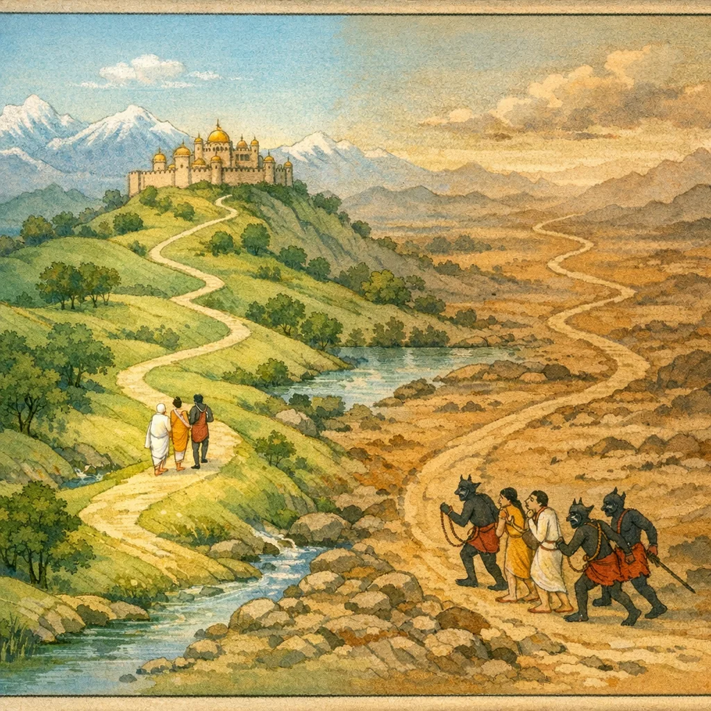 The road functions as a symbolic projection of karma and mental disposition: merit compresses distance and softens experience, while sin expands distance and intensifies suffering, turning ethics into an experiential geography that teaches causality through imagery.