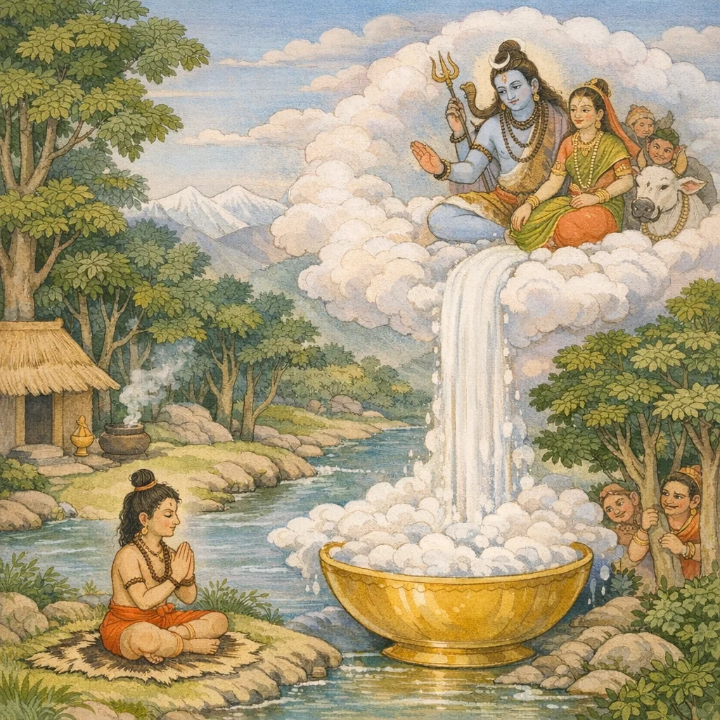 By the grace of Mahādeva, for one whose destiny had ripened and whose auspicious attainment was near, the austerity became as a doorway—born from the longing for milk.