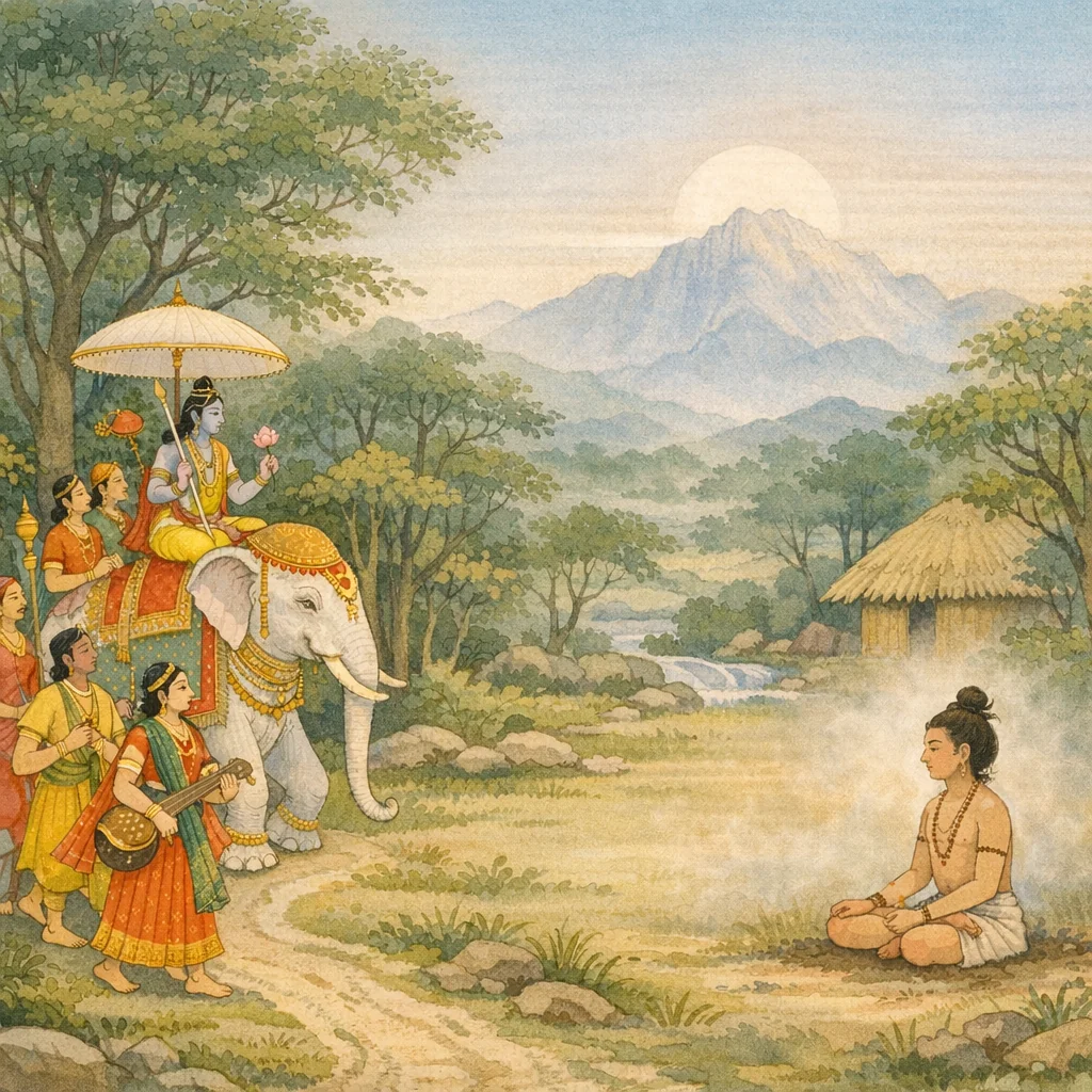 Then Sadāśiva went to the sage’s forest of austerities, mounted upon a splendid white lordly elephant. Accompanied by devas, asuras, siddhas, and great serpents, he himself assumed the resplendent form of the king of the immortals (Indra).