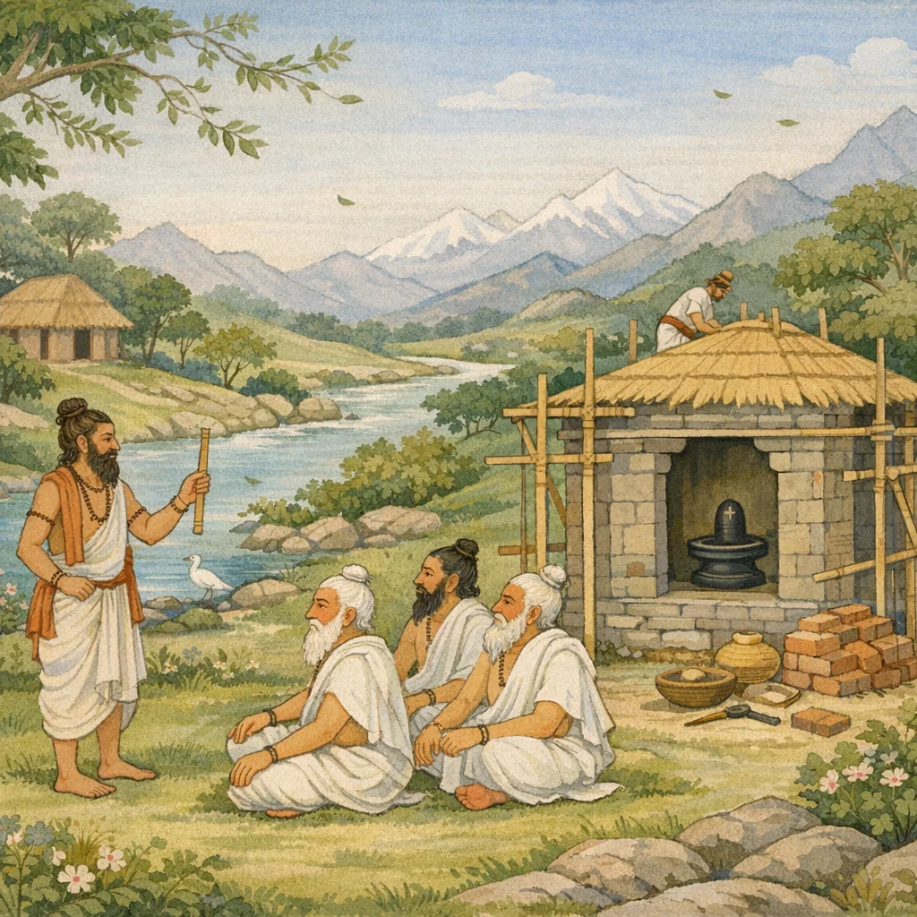 First, the temple superstructure (vimāna) should be fashioned according to sacred architectural science, adorned with divine hosts. Within it, in the beautiful sanctum (garbha-gṛha)—firmly built and shining like a mirror—the worshipful presence of Śiva is to be established.