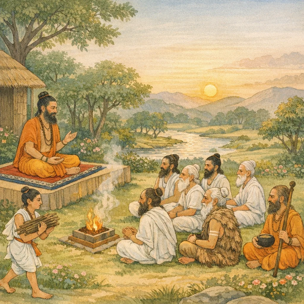 The sages said: “O Lord, explain to us in due order the Agni-sacrifice, the worship offered to the gods, the Brahma-yajña as well, the honoring of the Guru, and the means by which Brahman (the Supreme Reality) is satisfied.”