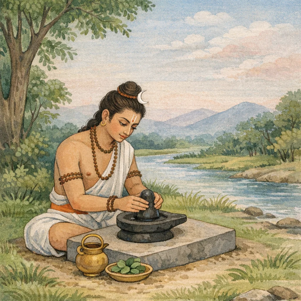 The earthen liṅga functions as a deliberately transient embodiment of the eternal: matter is purified, shaped, and worshiped to disclose Śiva’s immanent accessibility, while the Vaidika ordering of acts signals that liberation is pursued through disciplined embodiment rather than abstraction—ritual becomes a pedagogy of non-dual orientation toward Śiva.