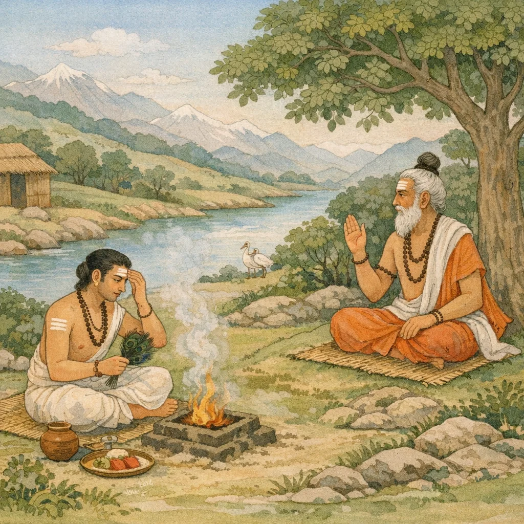 Meditating on Śiva—the Three-eyed Lord, the support of the three guṇas and the source of the three Vedas—one should remember the mantra “Namaḥ Śivāya” and then apply the Tripuṇḍra of sacred ash upon the forehead.