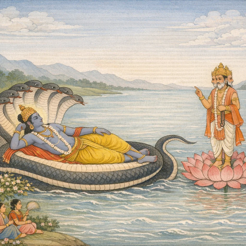 Viṣṇu’s serpent couch and the navel-lotus motif encode cosmological dependence and delegated creation: they symbolize how manifest authority (creation, preservation) is mediated through forms and functions, whereas the chapter’s deeper lesson critiques identification with those functions as the root of delusion.