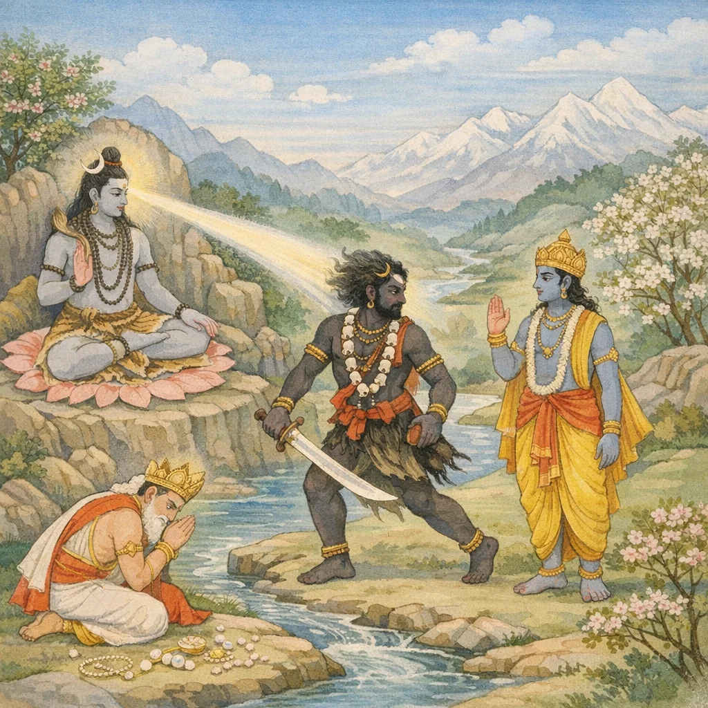 Bhairava is highlighted as a fierce emanation of Mahādeva/Īśa, functioning as a protective-juridical power; Śiva appears as the supreme arbiter, while Viṣṇu (Acyuta) is highlighted as the mediating intercessor within the divine hierarchy.