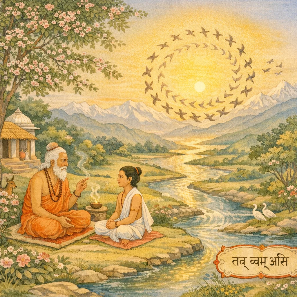 The Chhandogya Upanishad is a principal (mukhya) Upanishad associated with the Sama Veda. Rather than simply abandoning Vedic ritual, it internalizes ritual meaning through contemplative disciplines (upāsanā) and knowledge (vidyā), using the adhyāya–khaṇḍa structure to present a graded curriculum of symbolic meditations on Oṃ, Sāman chant, prāṇa, the sun, and space. Its most celebrated instruction occurs in Uddālaka Āruṇi’s teaching to Śvetaketu: “tat tvam asi” (“That thou art”). Here ‘sat’ (pure Being) is affirmed as the cause and ground of the world, while the diversity of name-and-form (nāma-rūpa) is understood as dependent manifestation of a single, subtle, all-pervading reality—illustrated by analogies such as salt dissolved in water. Major themes also include the pañcāgni-vidyā (five-fire doctrine), the two post-mortem paths (devayāna and pitṛyāna), and the dahara-vidyā (realization of Brahman in the “small space” within the heart). Ethical disciplines—truthfulness, self-control, austerity, and disciplined living—are emphasized as prerequisites for higher knowledge. The Upanishad ultimately establishes a core Vedāntic conclusion: liberation is attained through direct recognition of the identity of Ātman and Brahman.