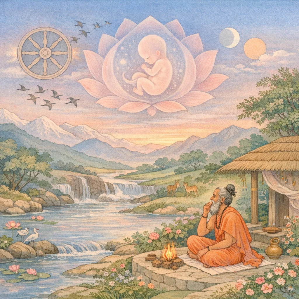 The Garbha Upanishad, traditionally linked to the Atharvaveda, is distinctive for treating conception, fetal development, and birth as a philosophical lens. By describing the body as a compounded product of the five elements (pañca-bhūta), shaped by karma and latent tendencies (vāsanā), it cultivates discernment (viveka) about impermanence and the limits of bodily identity. The womb is portrayed as a “microcosm” in which the jīva assumes embodiment according to prior action. Images of confinement and vulnerability, together with the motif of “forgetfulness” at birth, function as allegories for avidyā (ignorance) and sensory identification. Its central Vedāntic teaching is that body and mind are mutable, while the Ātman remains the unchanging witness. Human birth is therefore framed as a crucial opportunity for self-knowledge and liberation, through understanding the causes of bondage and transcending them.