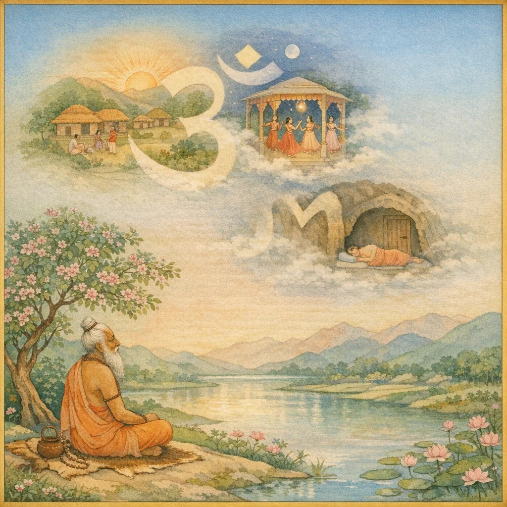 The Māṇḍūkya Upaniṣad, a mukhya Upaniṣad of the Atharva Veda, is exceptionally brief (12 mantras) yet philosophically dense. It takes Oṁ (praṇava) as a comprehensive symbol of Brahman/Ātman and uses it as a disciplined framework for analyzing consciousness. By examining waking, dreaming, and deep sleep, it articulates four “quarters” (pāda) of the Self: Vaiśvānara, Taijasa, Prājña, and Turīya. Turīya is not merely a fourth state but the ever-present witness-consciousness—peaceful, auspicious, and non-dual (advaita)—that underlies and illumines all experience. Meditation on Oṁ—A-U-M and the “soundless” remainder beyond phonemes—guides the seeker toward direct recognition of Ātman–Brahman identity, presenting liberation (mokṣa) as immediate knowledge rather than a produced result.