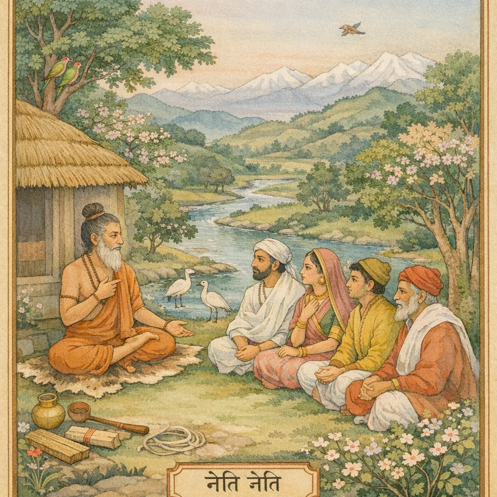 The Bṛhadāraṇyaka Upaniṣad is one of the oldest and most extensive mukhya Upaniṣads, associated with the Śukla (Vājasaneyī) Yajurveda. Emerging within the āraṇyaka setting, it does not discard Vedic sacrificial symbolism but interiorizes it, establishing self-knowledge (ātma-vidyā/jñāna) as the primary means to liberation (mokṣa). Its adhyāya–brāhmaṇa structure blends dialogue, rational disputation, and contemplative instruction, marking a historical shift from ritual centrality to philosophical inquiry into consciousness and being. Its central doctrine is the Ātman—witness of experience, immutable and deathless—and its ultimate unity with Brahman. The method of neti neti (“not this, not this”) serves as an apophatic discipline that prevents the Self from being objectified, disclosing it as witness-consciousness beyond all determinations. In the Antaryāmin Brāhmaṇa, Brahman is taught as the “Inner Controller” present within all beings, elements, and deities, relocating the sacred from external act to inner reality. Yājñavalkya’s debates in King Janaka’s court display a mature culture of philosophical argument. The Maitreyī dialogue teaches that everything is loved “for the sake of the Self,” grounding discernment (viveka) and dispassion (vairāgya). Karma, death, and rebirth are acknowledged, yet the highest aim is the realization of the Self that transcends fear and sorrow here and now.