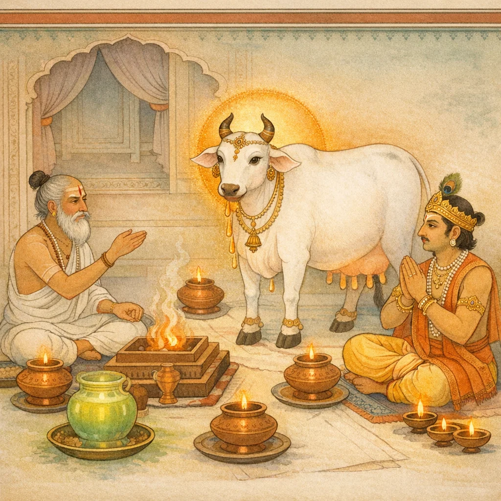 It is to be adorned with golden horns, have a tail of cloth, and have udders of clarified butter (ghee); it should be provided with a flower-blanket, and have mouth and tongue of sugar.