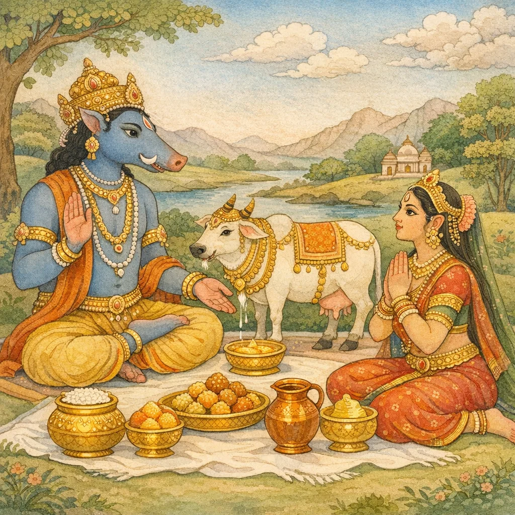 Although not an explicit ecological treatise, the chapter models a non-extractive ethic: merit is generated through crafted symbolic offerings (a constructed ‘cow’ made of honey/sugar products, metals, grains, cloth) and redistributed wealth rather than through harm to living beings. In the Varāha–Pṛthivī frame, such regulated generosity can be read as supporting terrestrial stability by promoting social provisioning, restraint, and orderly ritual conduct—values that indirectly protect Pṛthivī from disorder and scarcity.