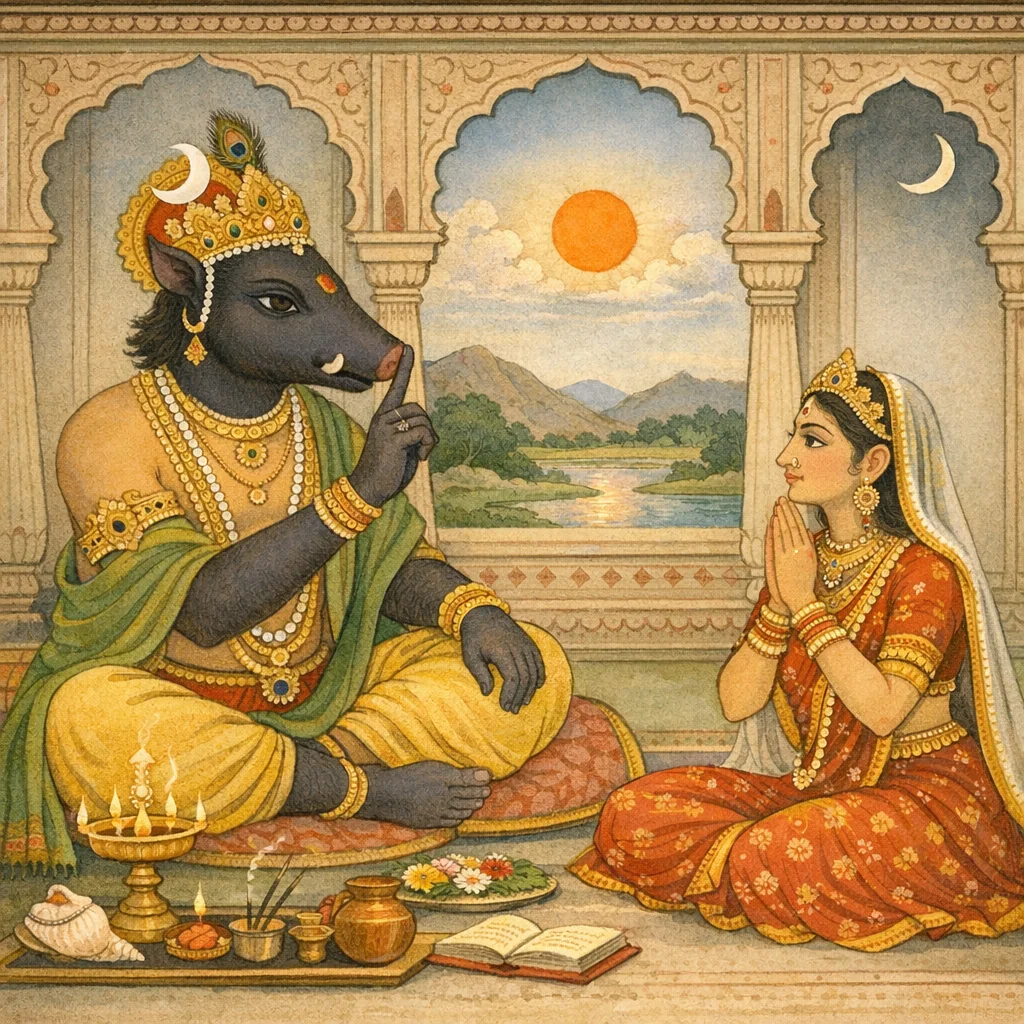 In reply to Pṛthivī’s question about deeds that bring heavenly welfare and steady human conduct, Varāha (as Nārāyaṇa) teaches a bhakti-centered ethic, downplaying wealth, mass charity, and many sacrifices when done without focused devotion. He declares that single-minded knowledge and worship of Viṣṇu is the decisive measure. The chapter prescribes a dvādaśī fast and a simple rite—water-offering, mantra, gazing at the sun, flowers, fragrance, and incense—with stated merit. Varāha then sets forth proper conduct for the four varṇas—brāhmaṇa, kṣatriya, vaiśya, and śūdra—stressing humility, self-control, non-malicious speech, and steadiness in duty. The teaching culminates in ascetic-style disciplines and restraints as a path toward yoga-like attainment, presented as upholding moral order upon Earth (Pṛthivī).