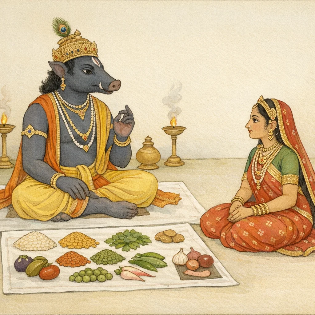 Adhyāya 119 continues the instructive dialogue between Pṛthivī (Dharāṇī/Vasudhā) and Varāha. Having heard a prior karmavidhi said to aid liberation from saṃsāra, Pṛthivī asks a practical question: by which substances (dravya), and with what mantra-linked procedure, should one perform the prāpaṇa so as to please the deity. Varāha, portrayed as dharma-jña and a skilled teacher, answers by listing permissible grains, vegetables, legumes, and certain animal products suitable for ritual use, along with items to be avoided. The chapter presents dietary choice as ritual discipline that upholds auspiciousness and social order, implicitly connecting the earth’s abundance with regulated, non-excessive practices of offering and consumption.