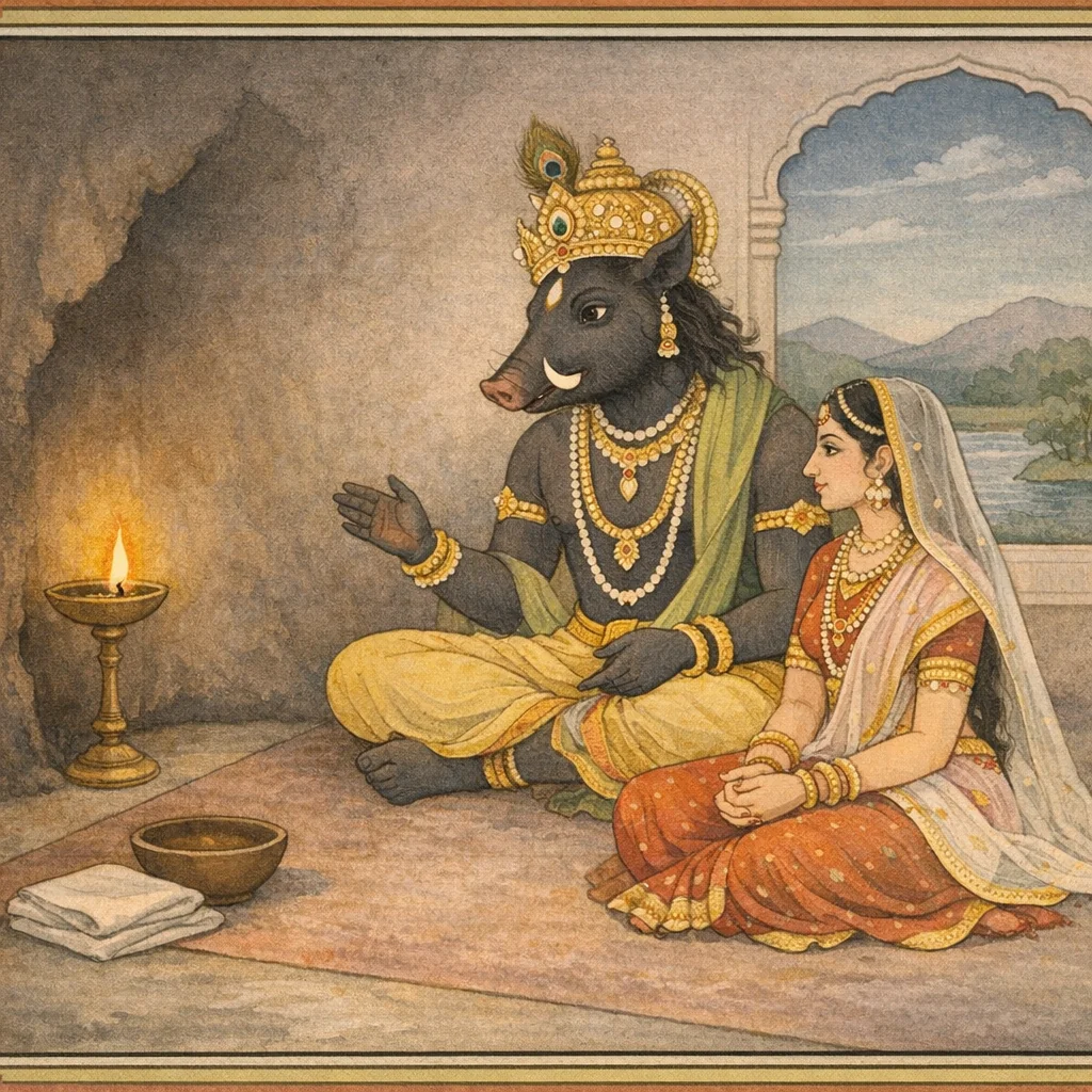 “By what practice are those devoted to action—those belonging to you—released from sin and the like?” Śrī Varāha said: “Listen, O goddess, in truth, to what is being explained by me, O sinless one.”