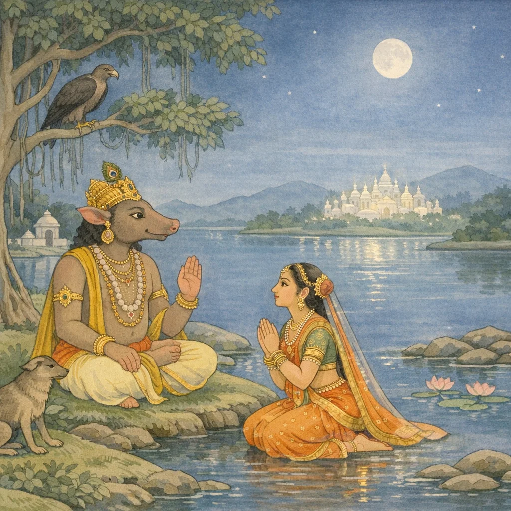 “Where you abide with me, O Goddess—where you were raised up from Rasātala—and where the Bhāgīrathī Gaṅgā stands established in my Saukarava.”