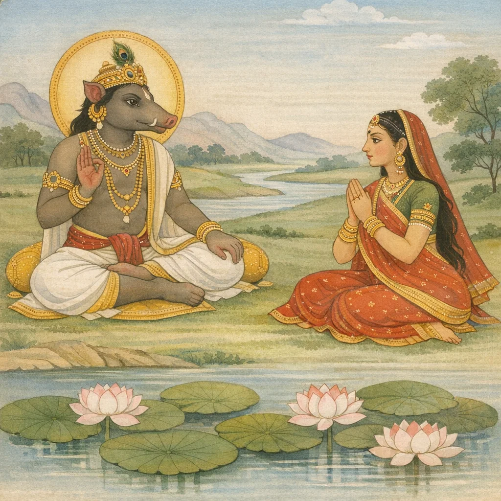 Adhyāya 142 unfolds as a teaching dialogue between Pṛthivī (Vasundharā) and Varāha. After receiving divine instruction, Pṛthivī asks about the practical burden of rules that fall upon women of limited strength, especially during rajas (menstruation), and how daily acts such as eating and ritual duties may be done without incurring fault. Varāha replies by redefining purity through bhāva (inner intent) and citta-samatā (mental equanimity): when the mind is placed in him, actions do not stain, “like a lotus leaf in water.” He gives mantras for rajasvalā practice and broadens the teaching into an ethic of self-restraint, sense-control, and renunciation-yoga. The chapter also prescribes ṛtu-kāla conduct for intercourse oriented to lineage and ancestral obligation (pitṛ-artha), warns against mistimed relations, and affirms that disciplined, mindful household life can remain compatible with liberation.