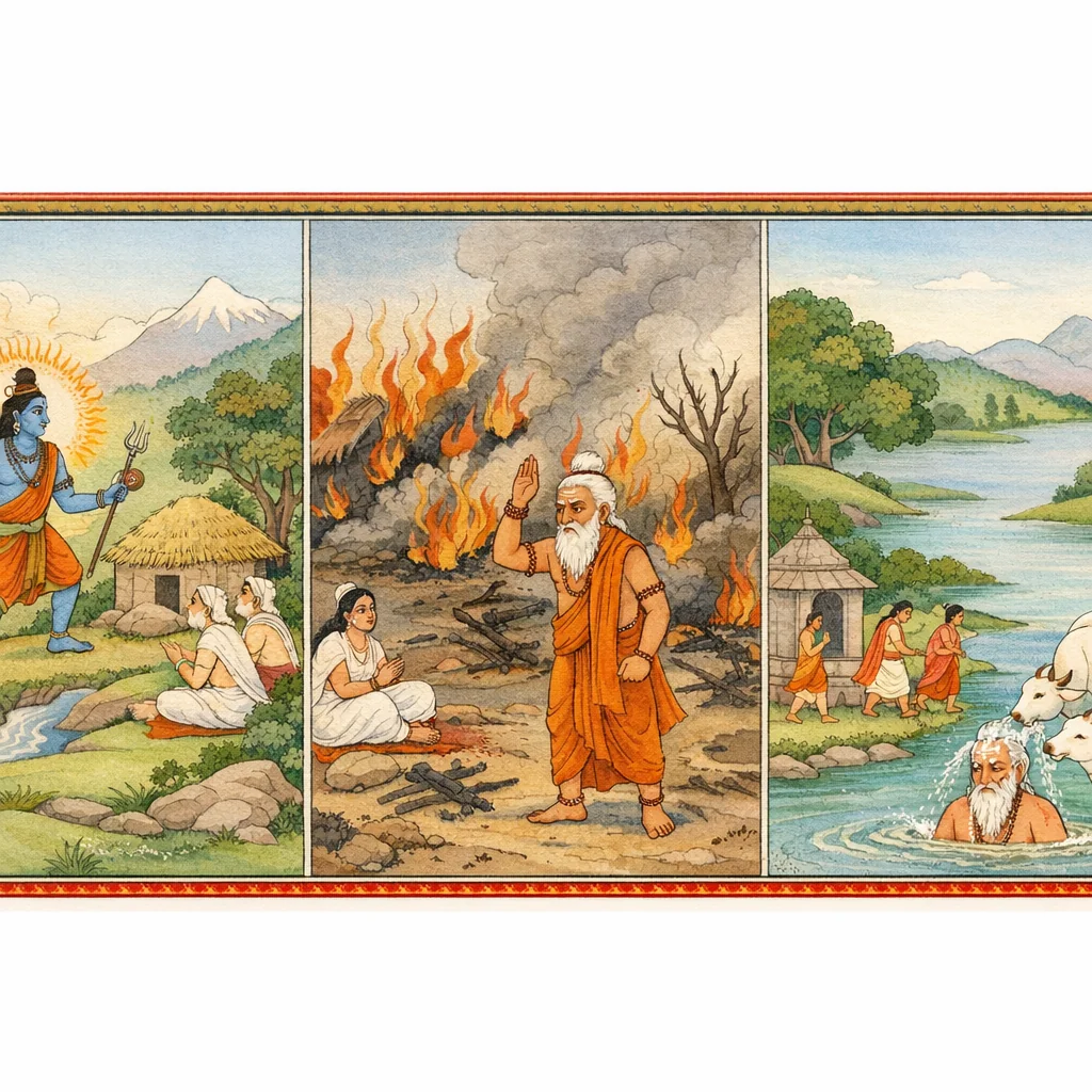 In dialogue, Pṛthivī asks Varāha to reveal an even more secret and purifying tīrtha beyond Rurukṣetra and Hṛṣīkeśa. Varāha discloses the hidden origin and greatness of the Himalayan upland tīrtha called Goniṣkramaṇa, linked to the Surabhī cows and the long austerities of the sage Aurva. When Īśvara (Rudra) approaches, his tejas burns Aurva’s āśrama, and Aurva utters a world-shaking curse that threatens the stability of the realms. A remedy is prescribed: Surabhī cows are brought to bathe Aurva, thereby neutralizing Rudra’s curse. Varāha then sets forth the site’s ritual discipline—bathing, fasting, circumambulation (pradakṣiṇā), and time-bound observances—connecting springs, banyan trees, and waterfalls with ethical restraint, purification, and the restoration of cosmic and environmental balance.