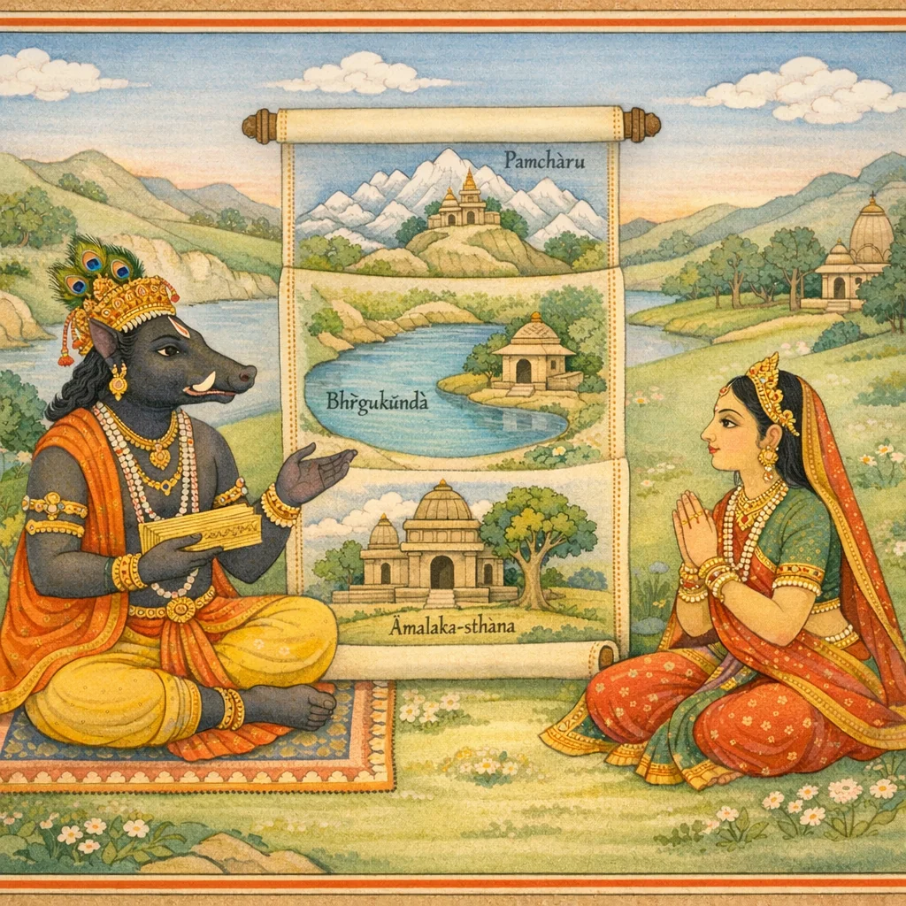 By placing Pṛthivī as the questioner, the narrative treats the land itself as a participant in ethical reasoning and purification. The tīrtha descriptions focus on removing pāpa (pollution/ethical residue) through water, regulated conduct, and restraint, implying a model where moral discipline and landscape sanctity mutually reinforce a ‘cleansed’ terrestrial order (e.g., Dhūtapāpa imagery of washing away impurity before water flows).