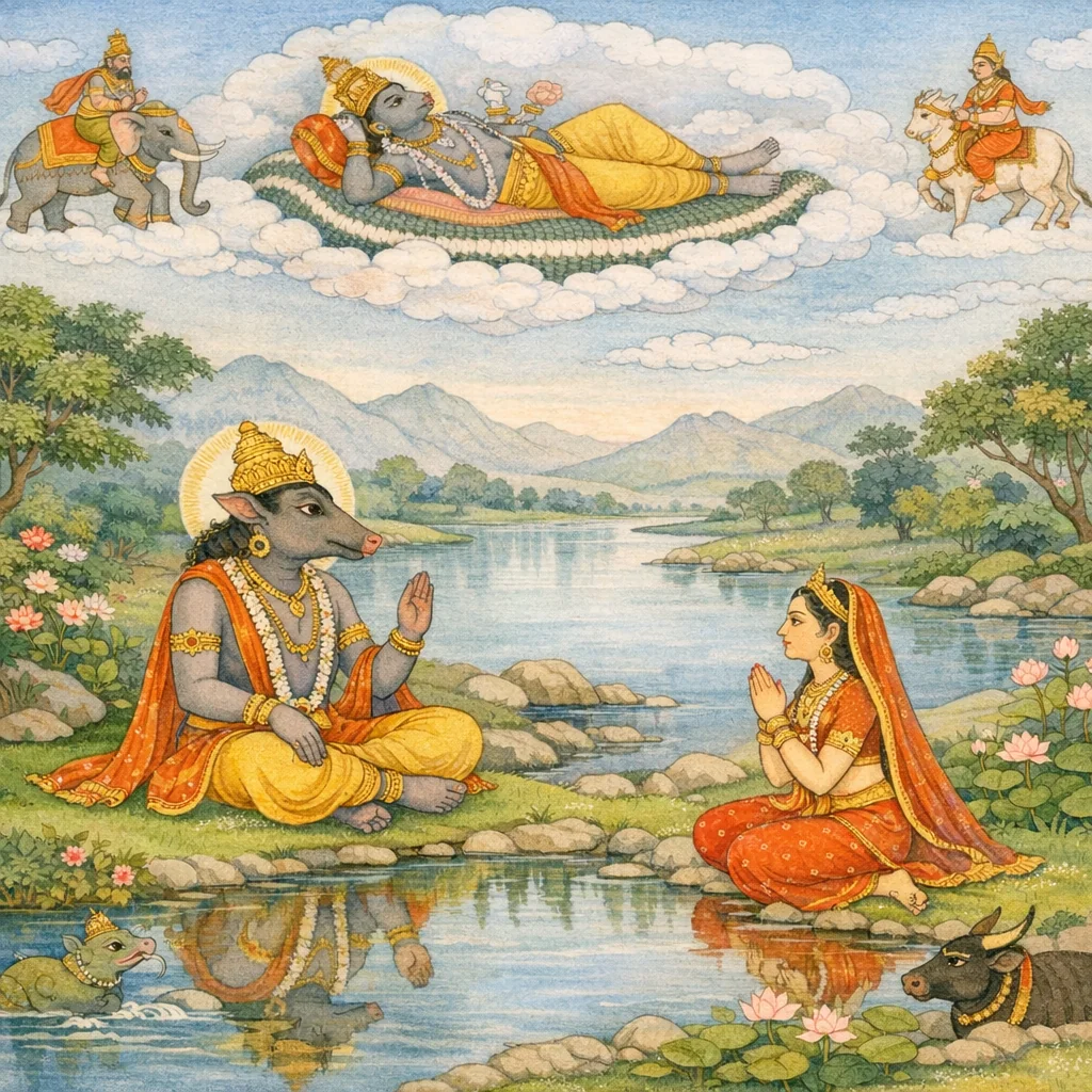 Through Pṛthivī’s question about protection of the kṣetra and Varāha’s answer assigning dikpālas and Śiva as guardians, the chapter depicts sacred geography as an ordered, safeguarded environment. The description of the Vimalaudaka-kuṇḍa’s stable levels across seasons and its counter-seasonal temperature qualities functions as a narrative of regulated waterscape—an idealized model of terrestrial stability and stewardship within a ritually maintained landscape.