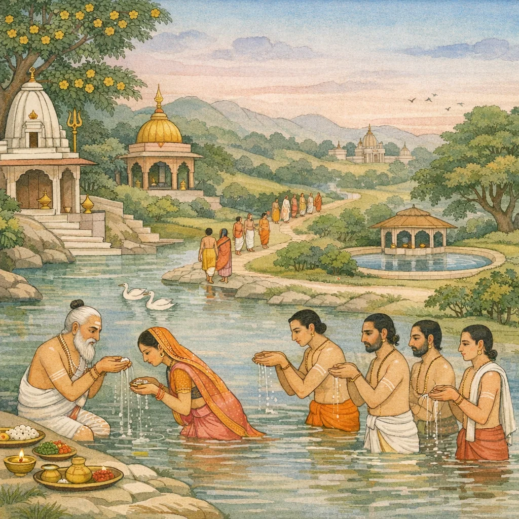 Then, having gone to Varṣakhāta, to the kuṇḍa that is a supreme remover of wrongdoing, one goes, bathes, and offers tarpaṇa—libations—to the ancestors; one is released from all wrongdoings.