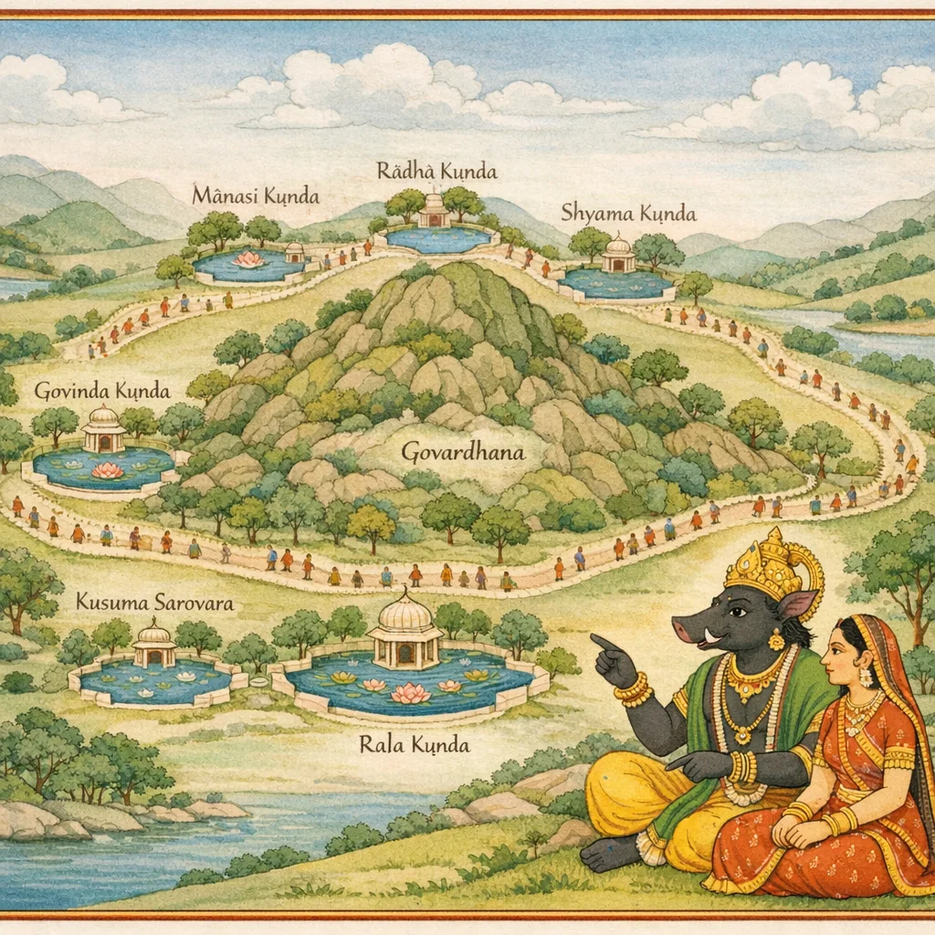 After completing the pilgrimage to the tīrthas, one should also keep an all-night vigil; and this is to be performed at Govardhana, for it is said to destroy great sins.