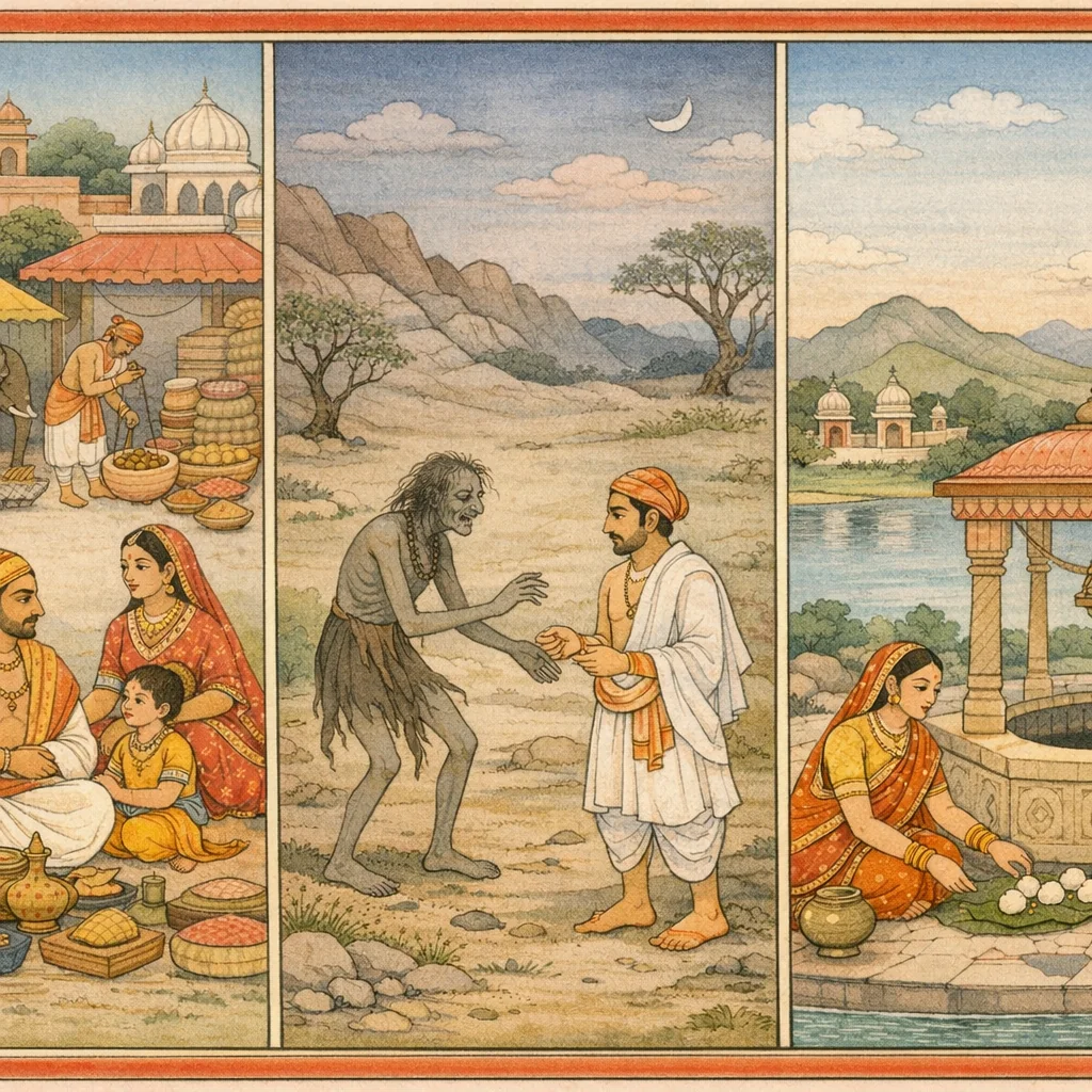 Varāha speaks to Pṛthivī and recounts an exemplum set in Pratiṣṭhāna in the Dakṣiṇāpatha. A wealthy vaiśya, Suśīla, absorbed in household upkeep and trade, neglects snāna, dāna, japa, homa, and deva-arcā, showing no devotion to devas or brāhmaṇas. After death he becomes a preta, wandering through arid, waterless places. A traveler-merchant, Vibhu, meets the terrifying preta; it first threatens to devour him, then offers conditional release: Vibhu must go to Mathurā and perform ritual bathing and piṇḍadāna at the Catuḥsāmudrika well in the preta’s name. The preta adds that even a tiny, reluctant gift once given at Viṣṇu’s temple—a single suvarṇa-māṣaka—sustained him, teaching that dāna and tīrtha-linked rites restore ethical balance and relieve post-mortem suffering.