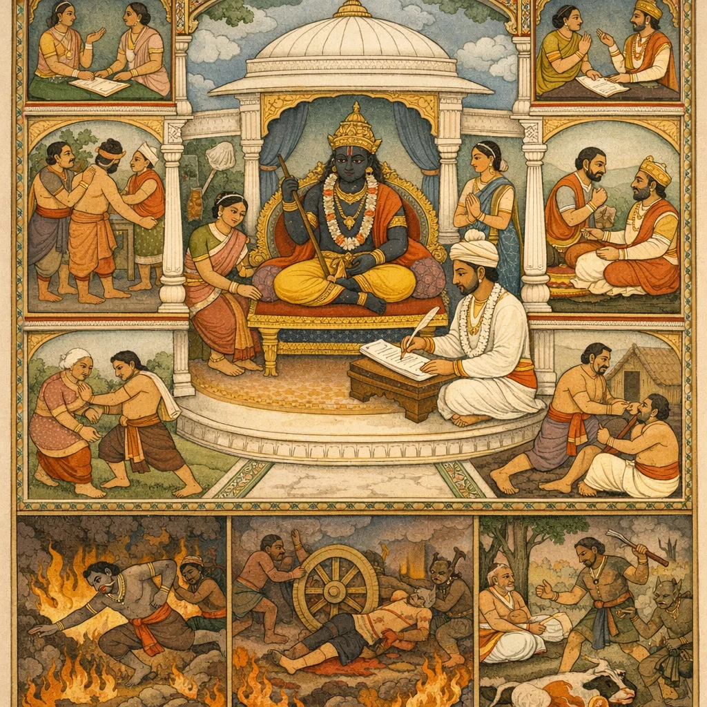 “Cook this wretched man in oil—or again in ghee and honey. Then cast him into a heated trough, and again upon a copper plate made hot. Having hurled this basest of men into the blazing fire, he later attains human birth again, and there he is tormented by debts.”