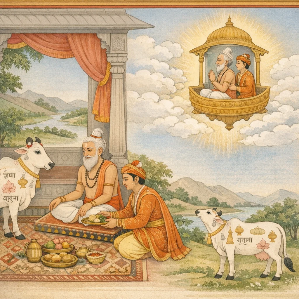 Where cows are, there is the world as a flourishing order, and the gods are present there, led by the God of gods. Where cows are, there too are Lakṣmī and the enduring dharma aligned with right discernment (sāṃkhya).