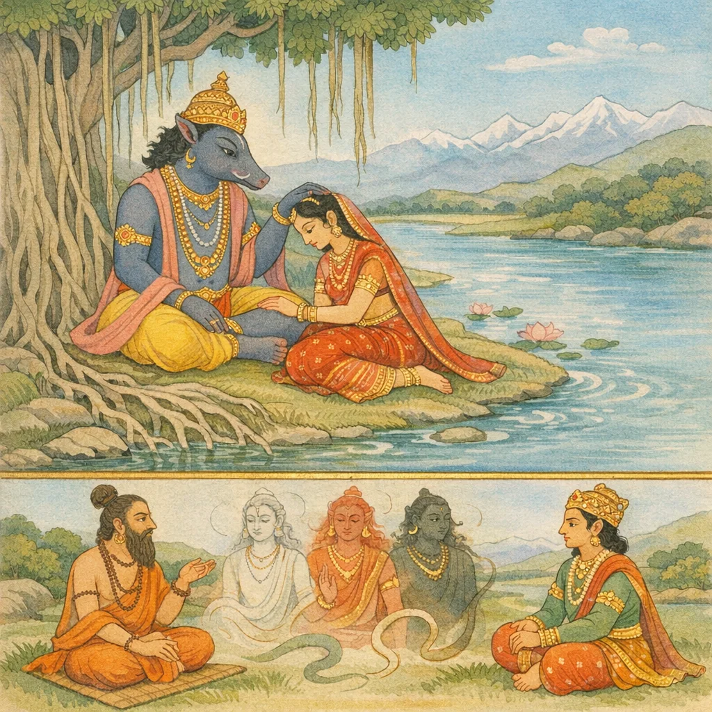 Varāha resumes his teaching after Durvāsas’ statement on the supreme Dharaṇī-vrata, describing Satyatapās’ journey to the Himavat region near the Puṣpabhadrā river, the Citrāśilā rock, and the Bhadravaṭa banyan. Pṛthivī then says that though she practiced this ancient vow through many kalpas, she had forgotten it; by Varāha’s grace she regains remembrance of former births (jātismaratā) and asks about Agastya’s return to King Bhadrāśva. Varāha relates how Bhadrāśva honors Agastya and inquires how karmic bondage and saṃsāra are cut off, and how one avoids grief in embodied and unembodied states. Agastya begins an allegorical account: a cattle-keeper king approaches the ocean, enters a serpent-filled forest, and meets tri-colored and manifold beings that envelop him—hinting at the interlocking of the guṇas/elements and the body—thus preparing a teaching on bondage and liberation.