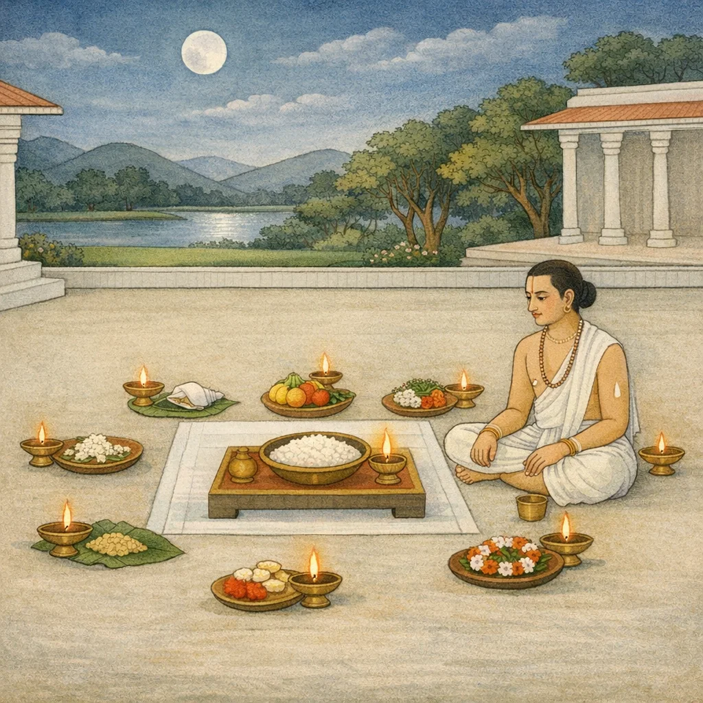 Although explicit ecological sites are not named, the chapter’s practices imply an ethic of terrestrial balance through restraint and regularization: naktāśana limits consumption, and offerings to the directions acknowledge a spatially distributed cosmology in which humans interact with the environment through measured, purified exchanges. In the Varāha–Pṛthivī frame, such disciplined cycles can be read as supporting orderly human–Earth relations by reducing excess and embedding conduct in seasonal-lunar rhythms.