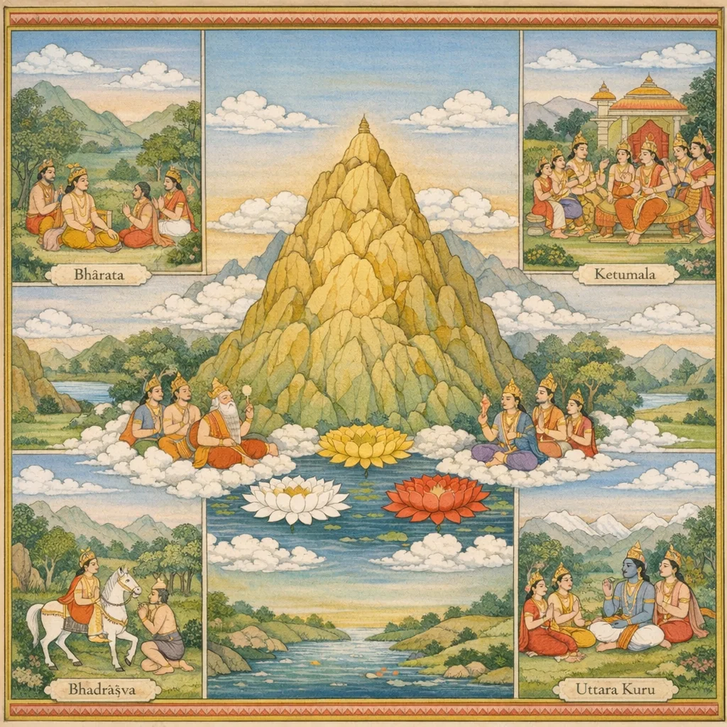 Environmental balance is expressed through cosmographic ordering: oceans encircle landmasses, mountain ranges partition varṣas, and river systems (though not fully listed here) render regions both connected and naturally bounded. The narrative presents mountains as stabilizing frameworks that shape habitation patterns for diverse beings (nānājātīni sattvāni), implying that ecological integrity depends on maintaining the world’s layered, proportional structure.