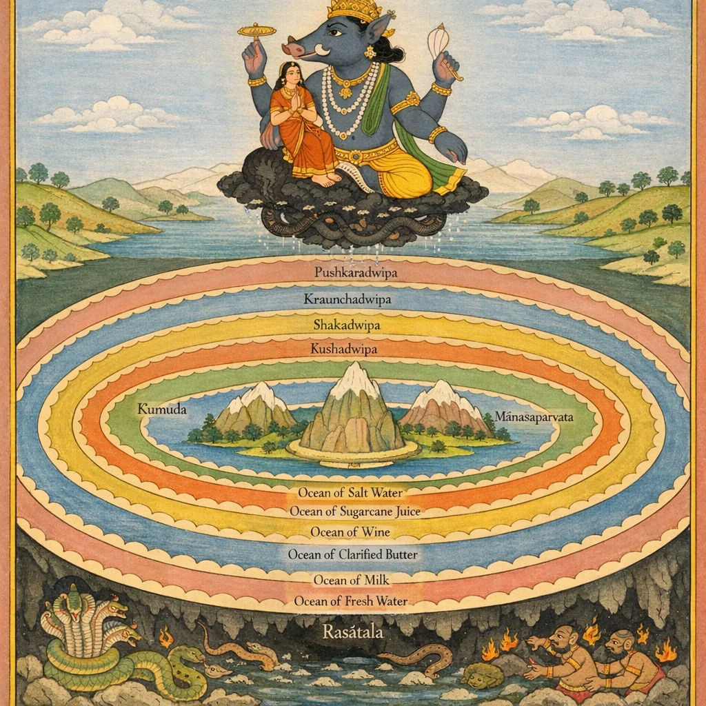 Enclosed by the Ghee-ocean, its expanse there is established as double; and there are seven principal mountains, as many regions (varṣas), and as many rivers. The mountains there—Sumahān, Pīta, Śātakumbha, Sārvaguṇa, Sauvarṇa, Rohita, Sumanas, Kuśala, … Jāmbūnada, Vaidyuta—these are the boundary (kula) mountains, and likewise the regions. Now the sixth dvīpa, Gomeda, is described. Just as Śālmala is enclosed by the Sura-ocean, so too the Sura-ocean is enclosed by Gomeda at twice that measure. There are only two principal mountains there: one is Tāvat-tāvasara, and the other is called Kumuda. The ocean is sugarcane-juice (Ikṣurasa), enclosed by Puṣkara at twice that measure. In the dvīpa called Puṣkara there is a mountain named Mānasa. That region too is divided into two, in due proportion. It is enclosed by the Sweet-water (Svādodaka) ocean; and then comes the cosmic ‘cauldron’ (kaṭāha). This is the measure of the earth, and also the measure of the brahmāṇḍa’s expanse together with its cauldron-like enclosure. The number of such egg-like universes is not known. In each aeon, Bhagavān Nārāyaṇa, in the form of a boar, entering to the end of Rasātala, lifts them up with a single tusk and establishes them in stability. Thus the account of the earth’s length and breadth has been told to you. May there be well-being for you; I shall go to Kailāsa, my abode, O twice-born.”