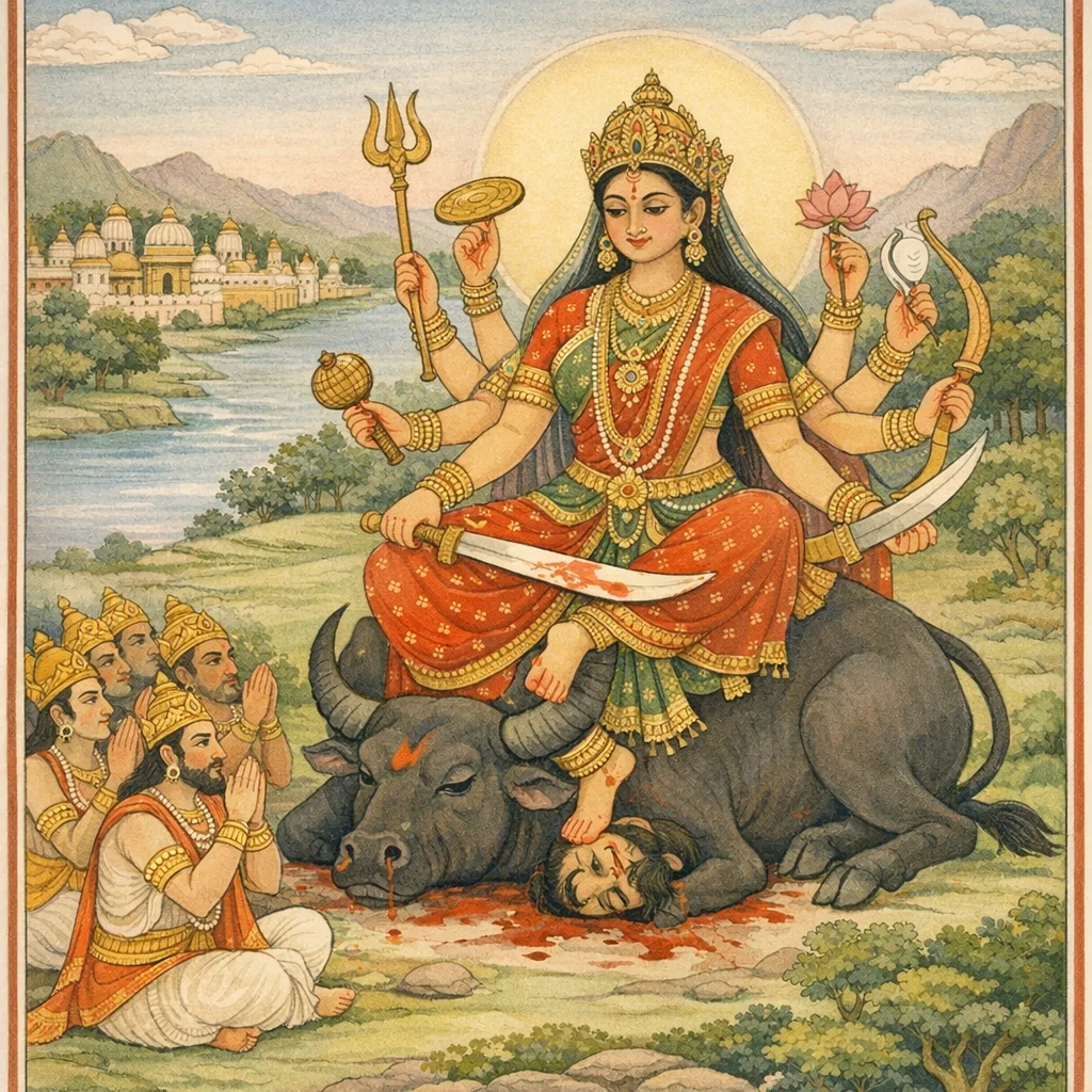 Then all those most fortunate maidens, in accordance with the Goddess’s command, assumed fearsome forms, bearing swords, shields, and bows; for the sake of battle they took their stand, intent on the destruction of the demons.