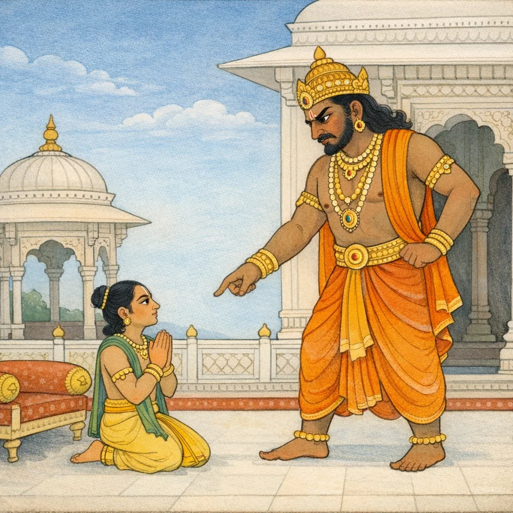 “Cast this wicked-souled wretch down from this palace—lofty as a hundred yojanas. Let him fall upon the mountain’s back here, and let the very frame of his body be shattered upon the rocks.”