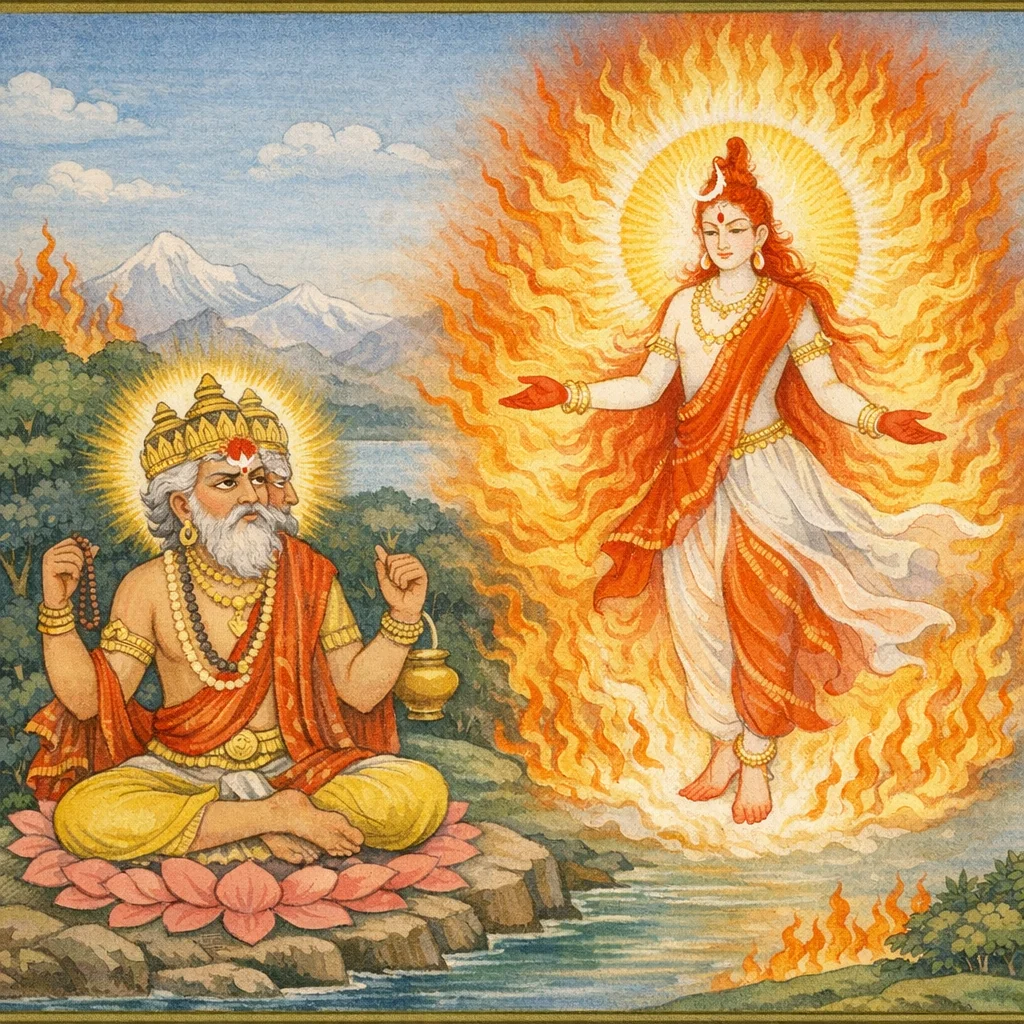 From his forehead—furrowed by tightly knit brows and kindled by wrath—there then sprang forth Rudra, blazing like the midday sun: a fearsome being of immense stature, whose form was half woman and half man.