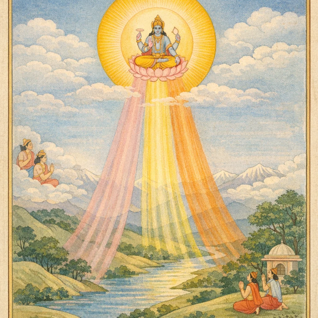 It presents the Sun’s daily cycle as a liturgical cosmology: the Veda is not only recited but embodied in cosmic time, indicating that kāla and prakāśa (illumination) operate as expressions of Viṣṇu-śakti.