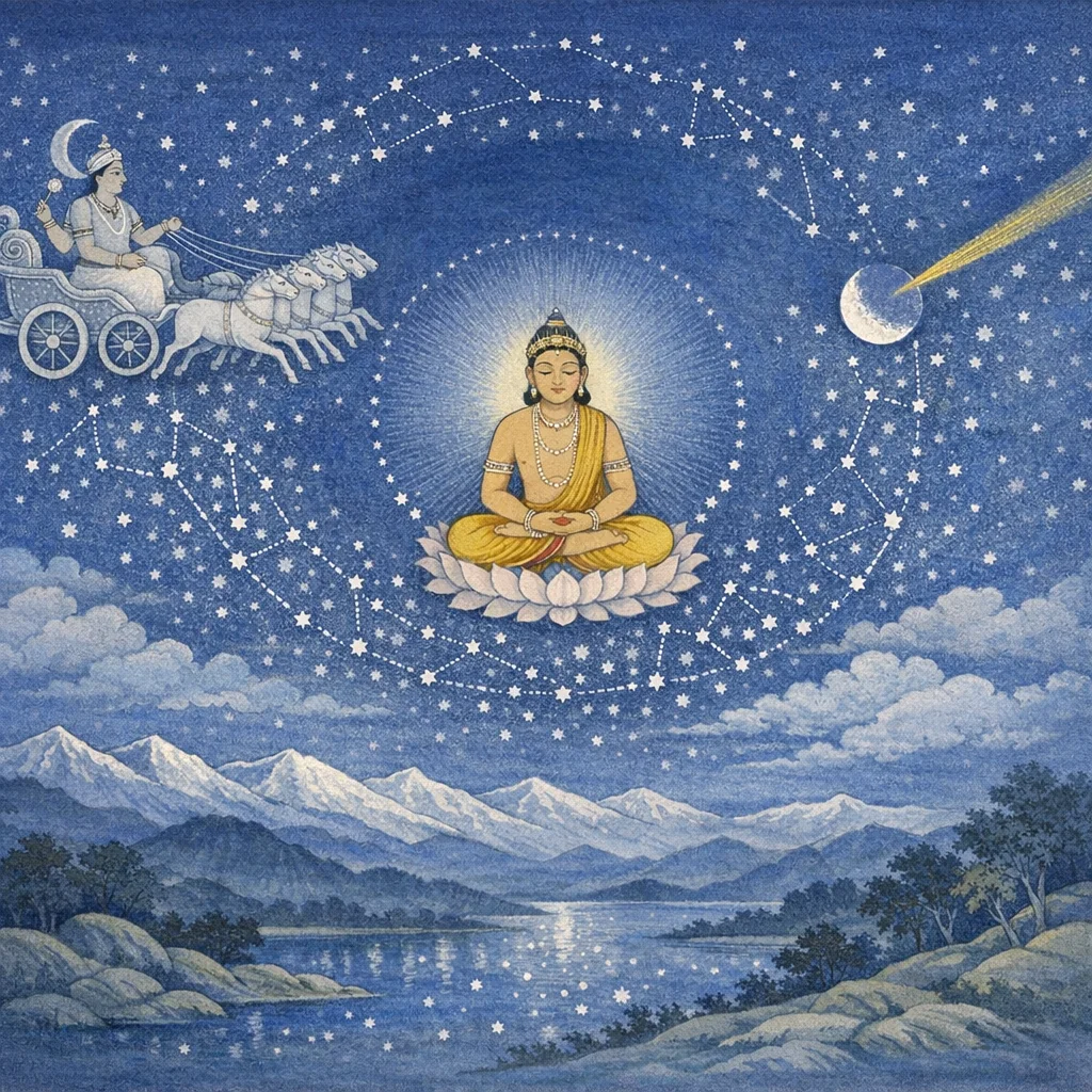 The constellations, abiding in their celestial tracks, are borne along in swift motion, upheld upon Dhruva as their axis. Their advance and recession proceed in measured order, like the waxing and waning of the Sun’s rays.