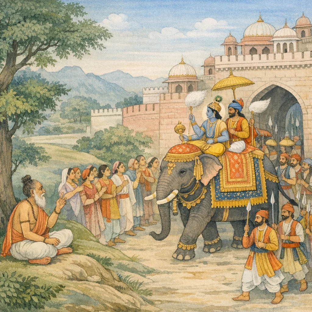 O king, when a thousand years had passed, Ṛbhu went again to that very city, intent on granting Nidāgha the cool wisdom of detachment that quenches the heat and weariness of worldly life.