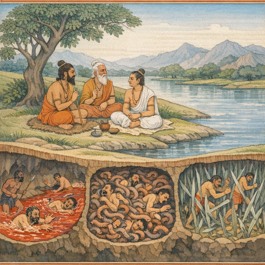 So too are other hell-realms: Pūyavaha, Pāpa, Vahnijvāla, and Adhaḥśiras; likewise Saṃdaṃśa and Kṛṣṇasūtra—along with Tamaḥ and Avīci as well—each a domain where the fruits of wrongful acts ripen into suffering under the unerring moral order within Lord Viṣṇu’s sovereign cosmos.