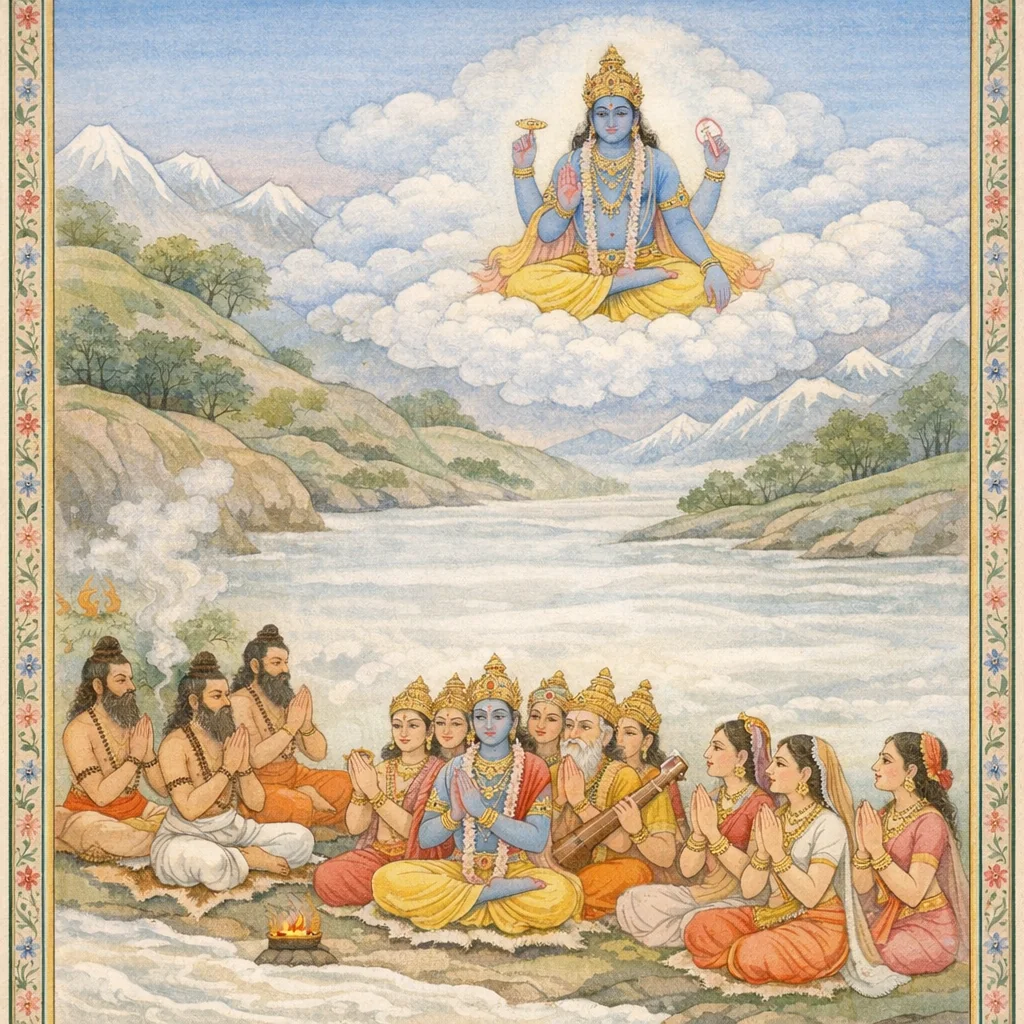When the hymn came to its close, the gods beheld the Supreme Lord—Hari—seated upon Garuḍa, His hands bearing the conch, the discus, and the mace; the Sovereign of the devas stood revealed before them.