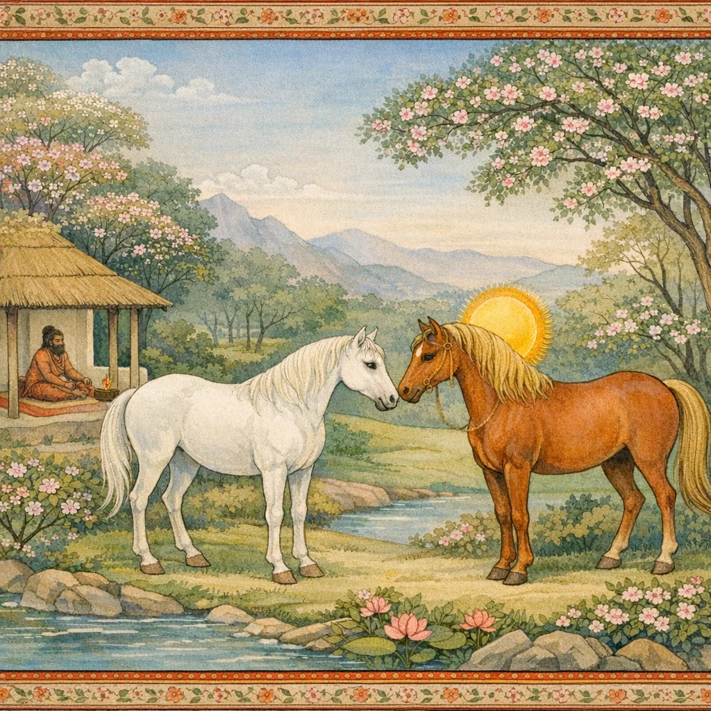 Assuming the form of a horse, he too drew near to her; and from her the two divine Aśvins were born. From the final issue of that seed, Bhāskara—the Sun—brought forth Revanta.