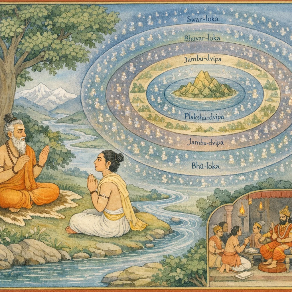 O great sage, within this cosmic egg (the brahmāṇḍa) on every side abide the seven continents, the pathways of the nether realms (Pātāla), and the seven worlds (lokas) within, arrayed as the ordered domains of the universe.