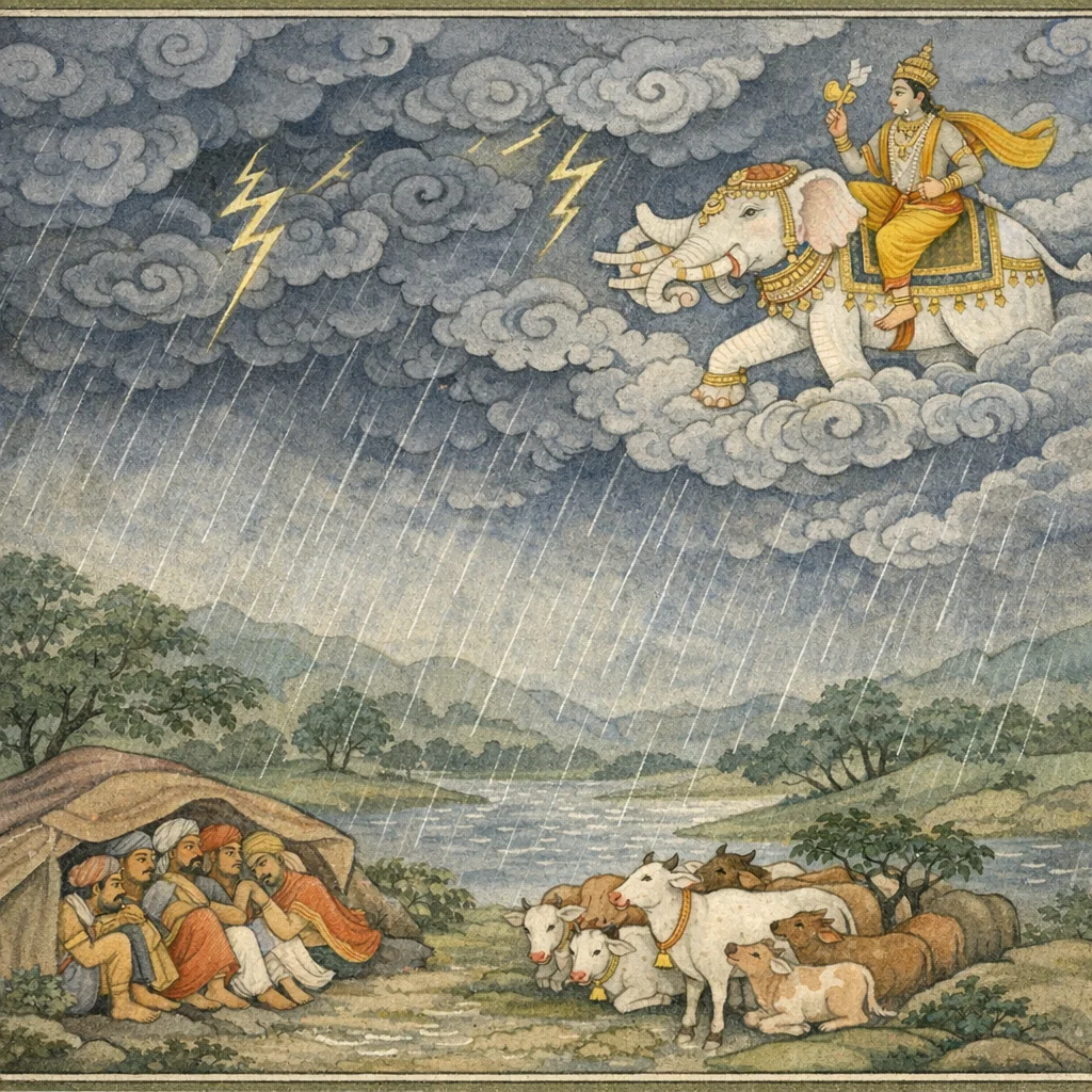 Parāśara tells Maitreya that Indra, angered at being “checked,” commands the Saṃvartaka host of clouds to act at once. Striking at Vraja’s very life—its cattle—he unleashes a dreadful storm of wind and rain; darkness spreads, earth and sky seem merged in one flood, and lightning and thunder deepen the ruin as cows and calves suffer. Seeing Gokula overwhelmed, Hari resolves to protect the whole settlement from Mahendra’s pride-born assault. Śrī Kṛṣṇa uproots Govardhana and holds it aloft with one hand like a vast umbrella, directing the cowherds and cowherd women to take shelter beneath with carts and herds. For seven nights the clouds pour down, yet Kṛṣṇa stands unwavering, praised by the Vrajavāsins. At last Indra’s vow fails; he withdraws the clouds, the sky clears, Kṛṣṇa sets the mountain back in place, and all return safely.