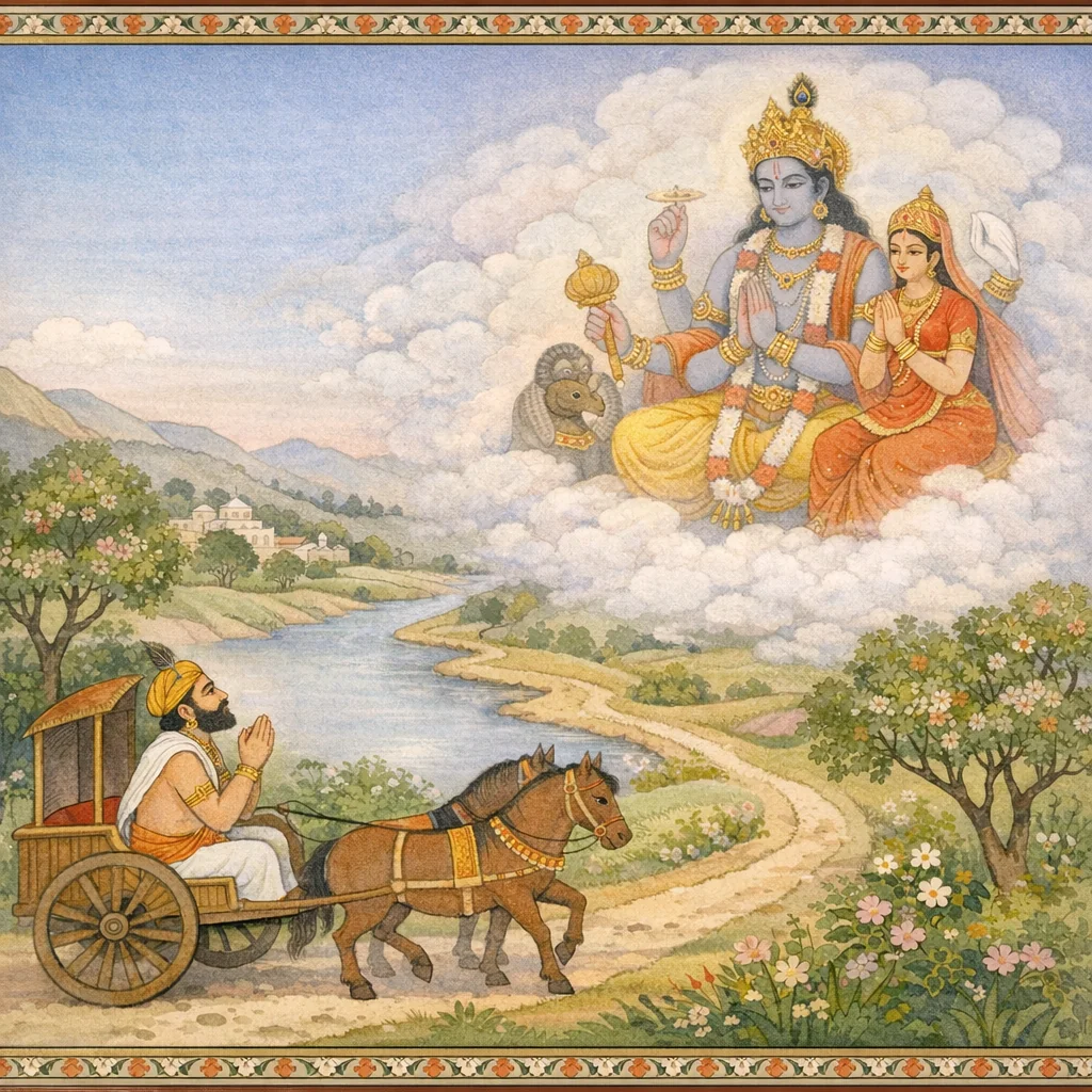 Parashara tells Maitreya that Akrura hastened by swift chariot to Nanda’s Gokula, inwardly cherishing the supreme fortune of beholding Sri Krishna. In his inner reflections arise Vedic-Vaishnava truths: the Disc-bearer as an amsha-avatara, the blessed sight of lotus-eyed Vishnu’s face, the Lord’s mouth as the source of the Vedas, and the Supreme as Yajna-Purusha, Purushottama. Parashara expounds Vishnu’s all-pervasiveness, His unknowable nature even to the gods, the bondage of maya as worldly ties (father-son and the like), and crossing the waves of ignorance by taking refuge in the Lord seated in the heart. In Gokula Akrura sees Krishna at the milking—radiant as a blue lotus, marked with Srivatsa, clad in yellow, smiling with gentle charm—and Balabhadra, likened to Mount Kailasa. Thrilled with devotion, Akrura recognizes Him as the Supreme Abode and prays to touch Him; the chapter ends in bhakti and surrender.