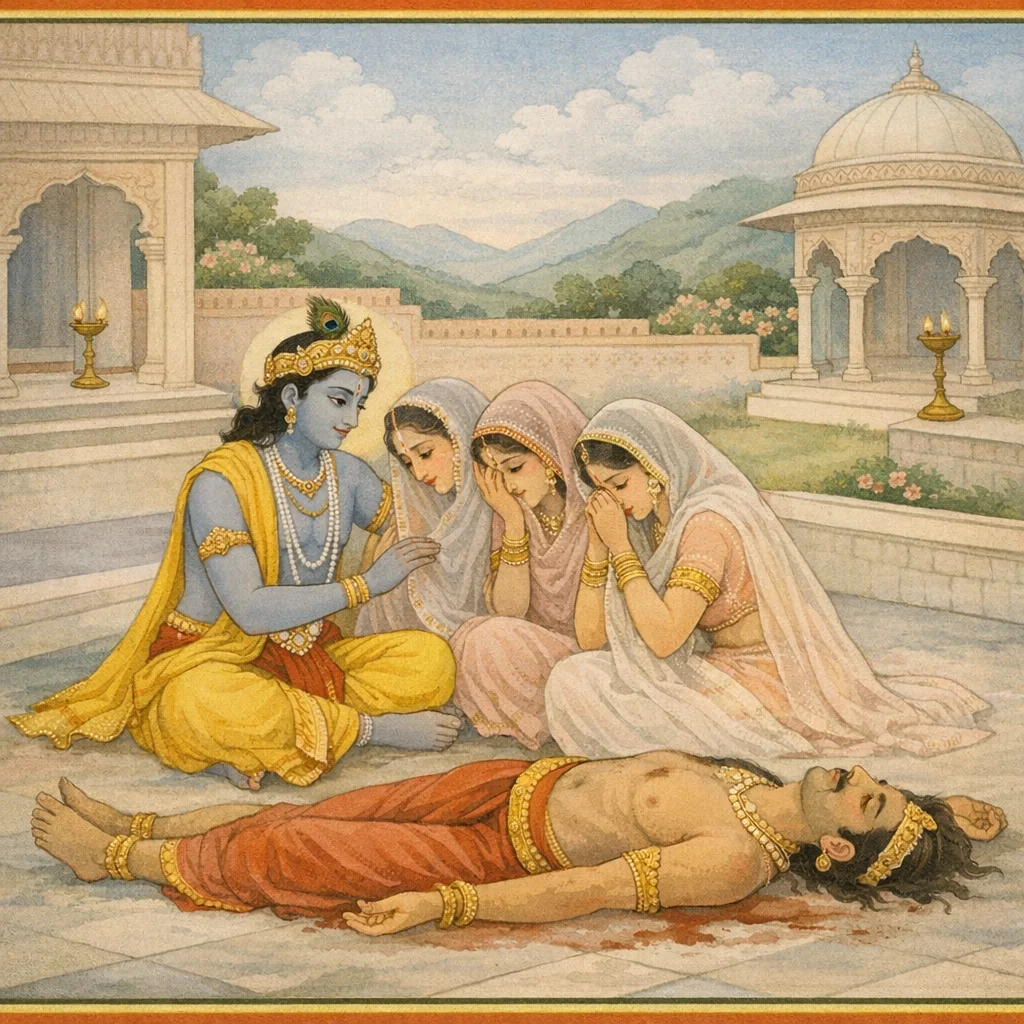 Then Kamsa’s wives gathered around him as he lay slain upon the earth, and they wept; and his mothers too, overwhelmed and flooded by grief and sorrow, lamented bitterly.
